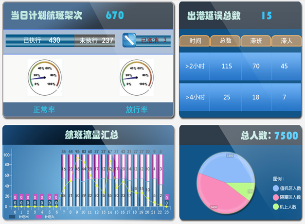 通过整合航班信息、旅客数据及安检信息等机场内部数据,为用户提供实时的航班流量、延误情况、楼内旅客量等动态视图,并且实现了对航班整个生命周期完整化、直观化、透明化的监控,从而进一步提高了运行指挥部门(AOC、TOC)掌握机场的整体运行情况的实时性与全局性,为机场方面精确定位航班延误与旅客滞留问题的瓶颈提供了决策支持信息,有利于根据机场运行的实时情况及时有效的采取应对措施,为提升机场总体运行、服务品质奠定基础。